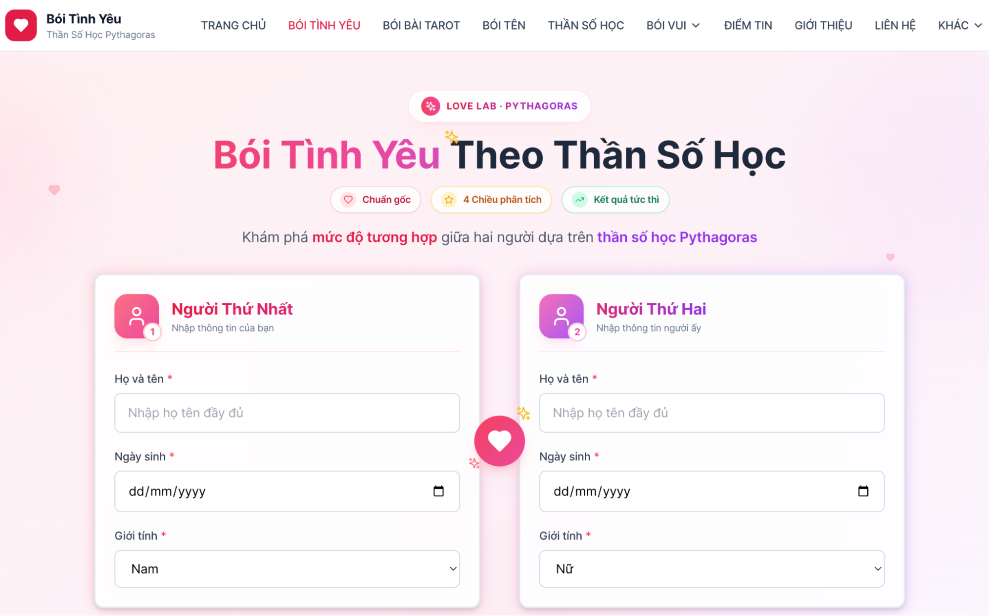 Bói tình yêu là một hình thức giải trí dựa trên tên gọi, ngày sinh hoặc các hệ thống như thần số học, tử vi, cung hoàng đạo… nhằm khám phá mức độ hòa hợp giữa hai người. Nhiều bạn trẻ tìm đến bói tình yêu để có thêm góc nhìn về cảm xúc, kỳ vọng và sự tương thích trong mối quan hệ.
